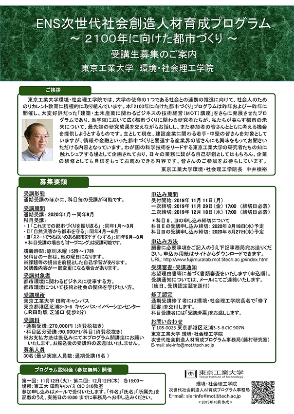 2019年度 ENS次世代社会創造人材育成プログラム ~ 2100年に向けた都市づくり ~ パンフレット