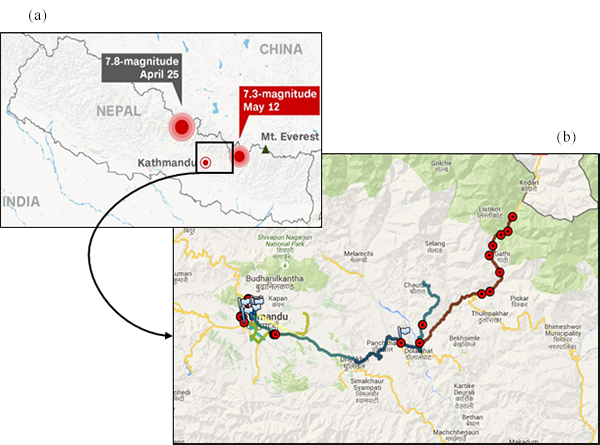 (a) Map of Nepal showing the epicenters and (b) areas surveyed indicated by red circles