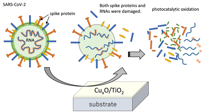 The team carefully investigated the antiviral mechanism using sodium dodecyl sulfate-polyacrylamide gel electrophoresis (SDS-PAGE), ELISA assay, and RT-qPCR analysis. These analyses strongly suggest that the Cu(I) species in CuxO denaturalises spike proteins and also causes RNA fragmentation of SARS-CoV-2, even under dark condition (Figure 3). Furthermore, white light irradiation causes the photocatalytic oxidation of the organic molecules of SARS-CoV-2. Based on this antiviral mechanism, the present antiviral material is not limited to a specific variant of the virus and will be effective to inactivate various types of a potential mutant strain.