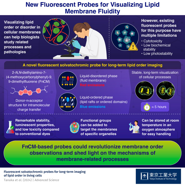 A new solvatochromic probe could help shed light on the relationship between lipid membrane fluidity and various cellular functions, report scientists at Tokyo Institute of Technology and Kyushu University. Thanks to an innovative design, the proposed probe offers remarkable stability, low toxicity, and exceptional fluorescent properties, making it possible to visualize real-time changes in lipid membrane order during complex processes, such as cell division.