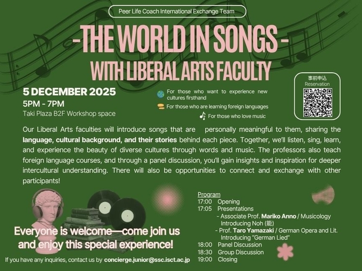 In this event, Liberal Arts faculty members will introduce songs that hold special meaning to them, sharing the linguistic and cultural background behind each piece. Through words and music, we will explore the beauty of languages and cultures together.