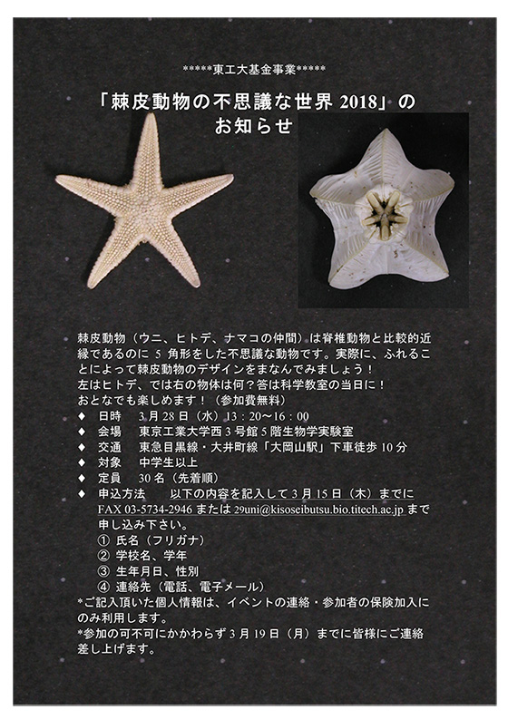 締め切り:2018年3月15日(木) 以下の内容を記入して、FAX(03-5734-2946)またはメール(29uni@kisoseibutsu.bio.titech.ac.jp)にてお申し込み下さい。