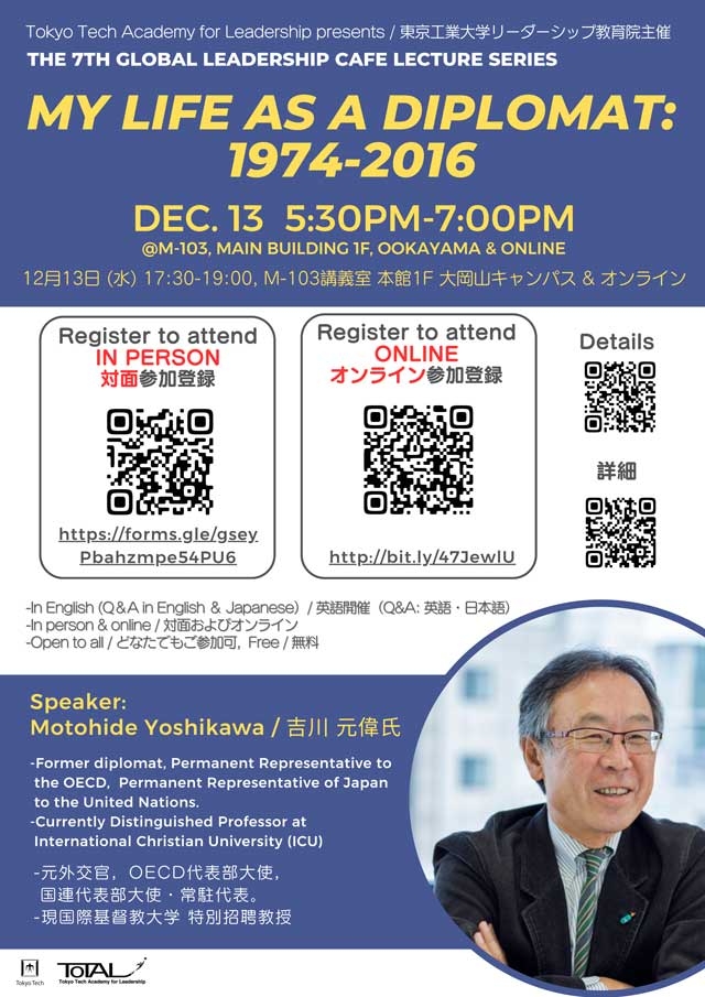リーダーシップ教育院(ToTAL)では、Global Leadership Café講演シリーズの第7回を2023年12月13日(水)に開催いたします。今回は、世界各国で駐日大使を務め、経済協力開発機構(OECD)代表部大使、国連代表部大使・常駐代表などを歴任された元外交官(現国際基督教大学 特任招聘教授)の吉川元偉(よしかわ もとひで)氏をお招きし、大岡山キャンパスとオンラインでご講演を行っていただきます。