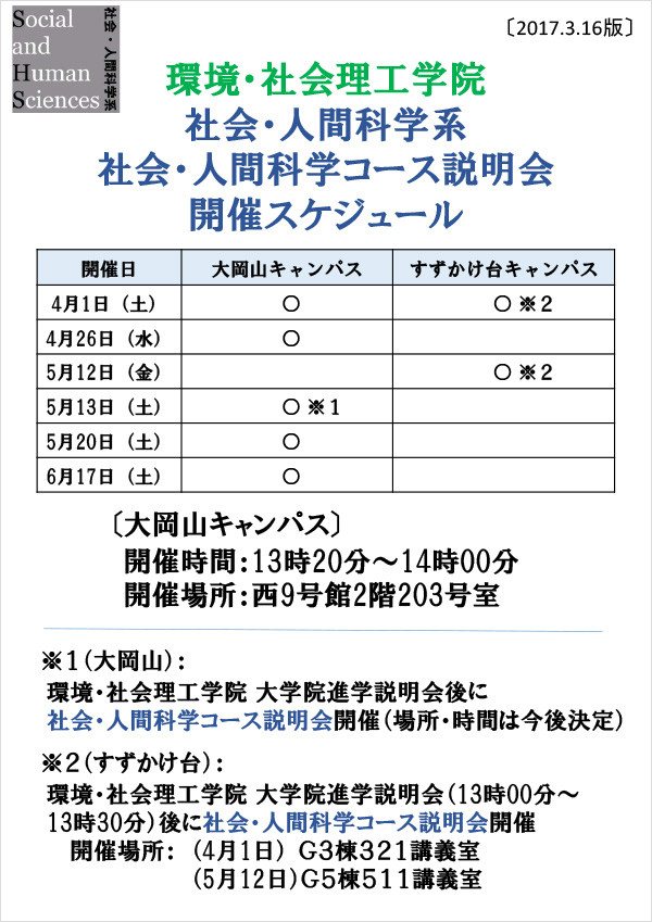 環境・社会理工学院 大学院進学説明会(13時00分~13時30分)後に、社会・人間科学コース説明会を開催します。