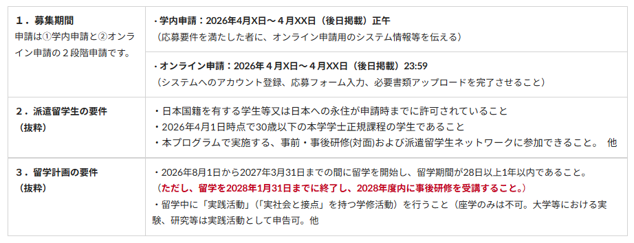 本プログラムは学生が自ら計画した留学プランを審査し、合格者に対して所定の奨学金等を支給するものです。留学内容は派遣交換留学を含む各種留学やインターン等、受入機関が存在するものであれば種類を問いません。合格者は事前・事後研修への参加や留学中に日本の広報活動(アンバサダー活動)を行うこと、留学後に留学に関する普及活動(エヴァンジェリスト活動)に協力すること等が求められます。
