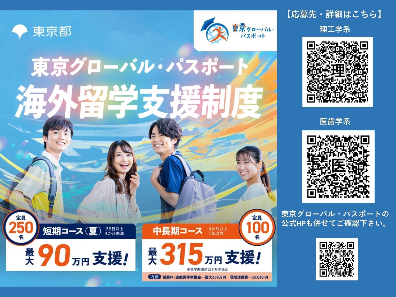 東京都が、より多くの大学生等が海外留学の最初の一歩を踏み出すきっかけ作りをサポートすることを目的に、海外留学の費用の支援等を行う都独自の海外留学支援制度「東京グローバル・パスポート」を新設しました。2026年度の派遣生のうち、新大学1年生等以外(在学生)の募集は終了しています。