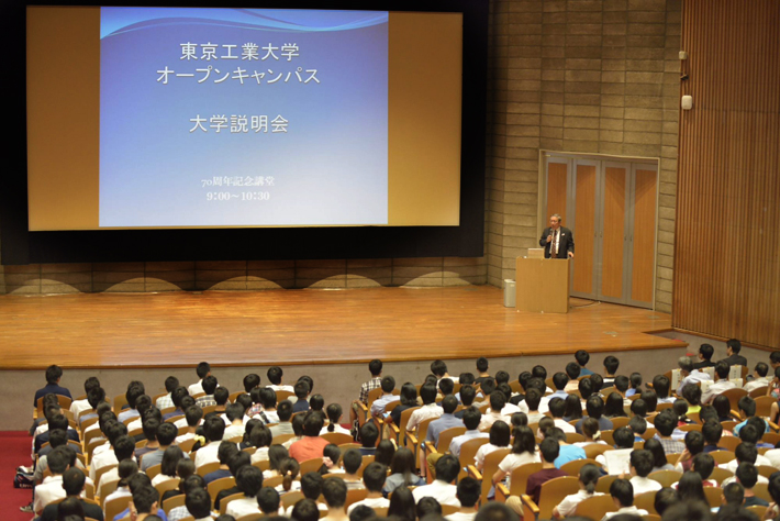 すべての企画に先立ち、70周年記念講堂にて大学説明会が開かれました。三島良直学長の講演に引き続き、各学部の説明、平成28年度から始まる教育改革の概要、入学試験の概要の説明がなされました。その後、同講堂に加えてくらまえホールやディジタル多目的ホールにおいて、類ごとに特色のある、類・学科説明会が行われました。