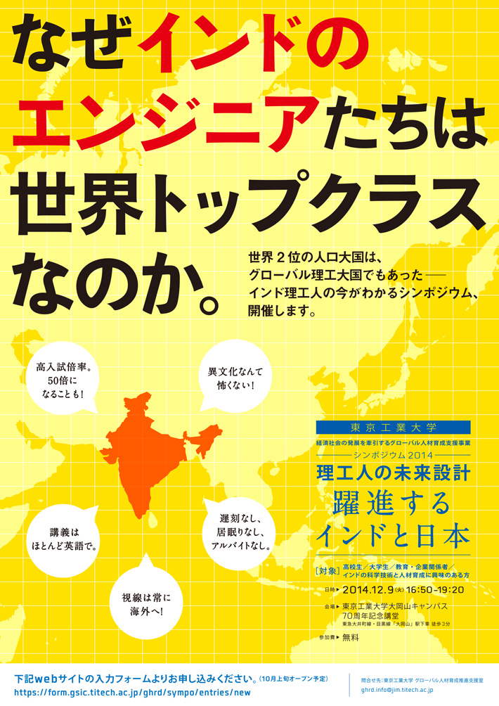 平成24年に採択された文部科学省「経済社会の発展を牽引するグローバル人材育成支援事業」の一環として、本学がテーマとする「新興国への科学技術協力」をとりあげ、発展目覚ましい新興国インドの科学技術や人材育成、日本との関係をテーマとしたシンポジウムを開催します。