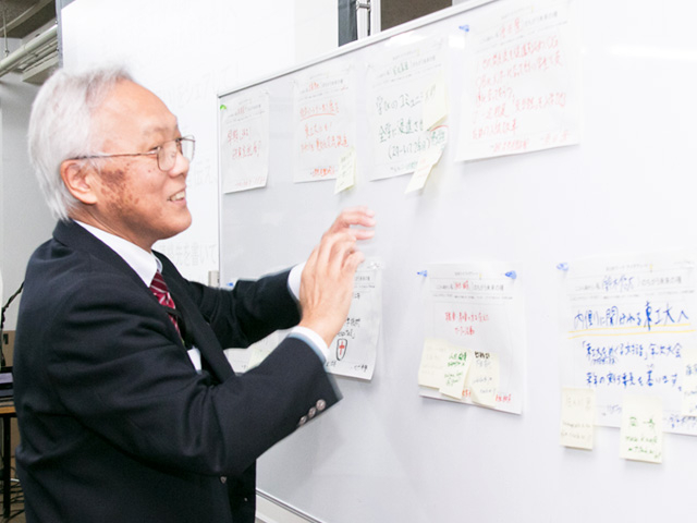 さらにこの「未来の種」を成長させるため、“自身のアイデアを紹介したい”、または“発表し共感できる仲間を募りたい”という参加者のための発表タイムを設けました。ここでは20名から申し出があり、産業界のどんな難問にもスパッと応える「東工大科学技術Hospital(ホスピタル)」の設立や、教職員・学生を交えたサークルの設立などさまざまな提案が行われ、気になった提案については自身の連絡先を書いた付箋を貼って“共鳴”の意志を示しました。最後に三島良直学長から本日の終了の挨拶があった後、参加者の中で最も若い第7類の近藤恭平さん(学士課程1年)の掛け声で締めくくりました。ワークショップ終了後、仲間を募りたい参加者を中心に分科会が行われ、各々の思いを話し合い仲間同士の連絡先等を交換して次のアクションにつなげました。