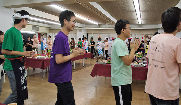 プログラム最後のさよならパーティでは鏡割りや参加国ごとのパフォーマンスが行われ、場を盛り上げました。また、チームごとに飛び入りのパフォーマンスを行う姿も見られ、参加者全員で盆踊りを楽しみました。