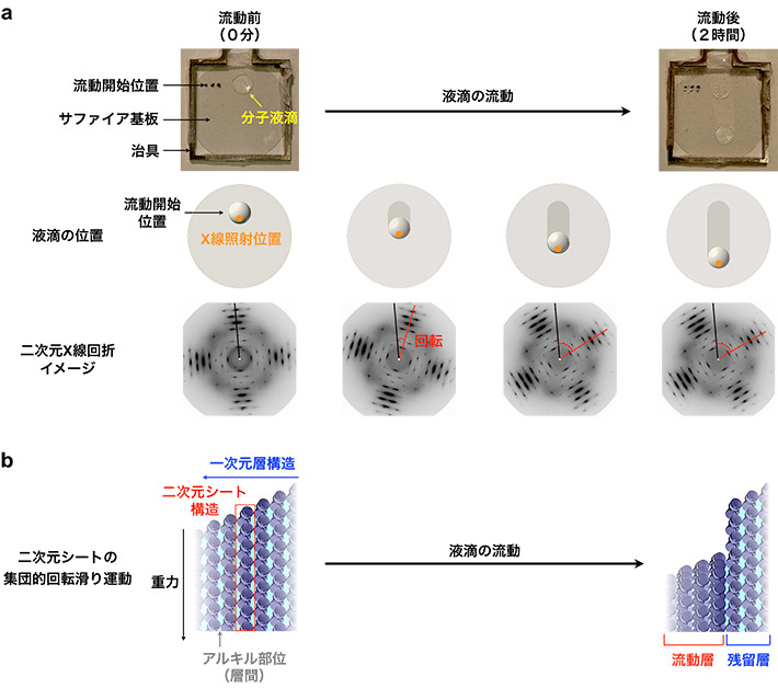 この液滴状物質は、基板を立てると下方向に流れるという流動性を示した。驚くべきことに、流れ落ちる過程においても、液滴中の構造規則性は全く損なわれなかった(図2a)。この特異な流動挙動の起源について、レオロジー測定[用語8]と固体NMR測定から検討したところ、「固まろうとする性質」と「流れようとする性質」が絶妙なバランスを保っていることが明らかとなった(図3)。