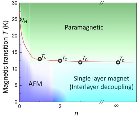 理論計算と実験的観察からn=2以上で層間磁性のデカッブリングが始まることが示された。デカッブリングは交流磁化測定によって調べた。図3に示すように10 K以下ではゆっくりした磁気緩和が明確に観察された。この緩和は層間のスピンの回転や層内のドメイン壁の運動によるものと考えられ、層間の磁気的カップリングが十分に弱くなる時のみ生じる。これらの結果から図4に示す磁気相図を明らかにできた。