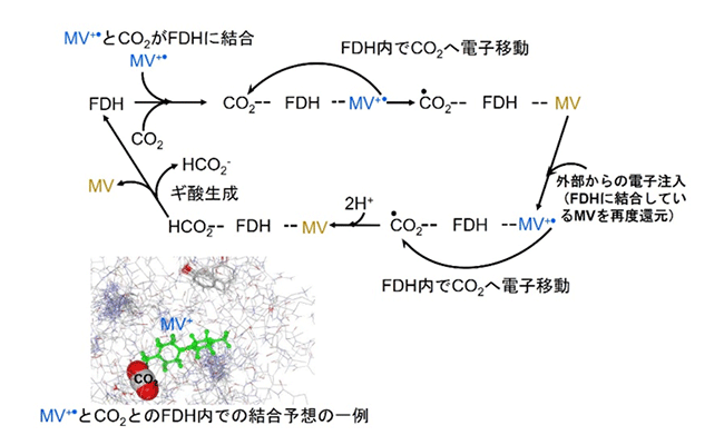 太陽光エネルギーを利用して二酸化炭素を有機分子に変換する人工光合成系を創製するための重要な要素技術として進められている触媒の開発において、ギ酸脱水素酵素(FDH)内で、補酵素であるメチルビオローゲンの陽イオンラジカル(MV.+)が、いかにして二酸化炭素をギ酸に還元するかについて、本質的な相互作用に関しては明らかではありませんでした。