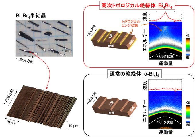 東京大学物性研究所の野口亮大学院生、黒田健太助教、近藤猛准教授、および東京工業大学科学技術創成研究院フロンティア材料研究所の笹川崇男准教授らの研究グループは、産業技術総合研究所物質計測標準研究部門ナノ材料構造分析研究グループの白澤徹郎主任研究員、東京大学大学院工学系研究科の有田亮太郎教授(理化学研究所創発物性科学研究センター チームリーダー兼任)、東京大学大学院工学系研究科の平山元昭特任准教授(理化学研究所創発物性科学研究センター ユニットリーダー兼任)、大阪大学大学院理学研究科の越智正之助教らの研究グループと共同で、擬一次元積層物質[用語3]における高次トポロジカル絶縁体の実現を、ビスマス臭化物 Bi4Br4(Bi : ビスマス、Br : 臭素)を用いた実験から明らかにしました。