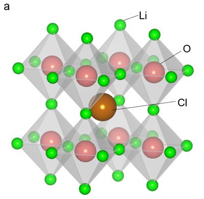 一般式ABO3と書かれるペロブスカイト酸化物(A、Bは陽イオン)は、機能性材料として古くから様々な用途で使われています。その代表例としては、強誘電体としてパソコンなどの電子機器に用いられるチタン酸バリウム(BaTiO3)が挙げられます。最近では、酸化物の枠組みを越えたCH3NH3PbI3のような有機無機ハイブリッドのペロブスカイト化合物が発見され、太陽電池への応用研究が進んでいます。一方、ペロブスカイト構造の構成元素の陽イオンと陰イオンの役割を入れ替えた化合物は、逆ペロブスカイト(またはアンチペロブスカイト)と呼ばれ、比較的新しい化合物として注目を集めています。(以下、ペロブスカイトと逆ペロブスカイトをまとめて(逆)ペロブスカイトと表記)一般式はM3BAと書かれ、Mが陽イオン、A、Bは陰イオンです。例えば、Li3OClは、単純な組成と構造を持つという利点に加えて、リチウムイオン(Li+)が構成元素の6割を占めることから、全固体電池の固体電解質として期待されています(図1a)。一般に、リチウムイオンの高速伝導を達成するためには、リチウムイオンと陰イオンの間のクーロン引力を抑えることが重要であることが知られていますが、Li3OClでは、酸化物イオン(O2-)や塩化物イオン(Cl-)の分極率が小さい(あるいは電気陰性度が大きい)ため、リチウムイオンとの強いクーロン相互作用をもってしまうのが問題点でした。