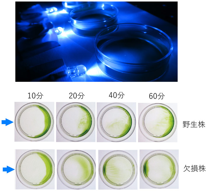シャーレ内のクラミドモナスに、矢印の方向から強い青色光を当てると、最初は、野生株、DYBLUP欠損株ともに光源から離れるが、欠損株では順化が起き、60分後にはほとんどが再び光源に向かう。