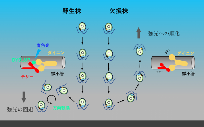 光と反対の方向に移動した野生株は、一時的に光に向かう運動を示すが、すぐに方向転換して強い光を回避する。この運動調節は、DYBLUPが青色光を受容し、ダイニンとテザーの結合を安定化させることにより生じる。DYBLUP欠損株では、ダイニンとテザーの結合が不安定で、方向転換する運動を行うことができず、強い光に順化してしまう。
