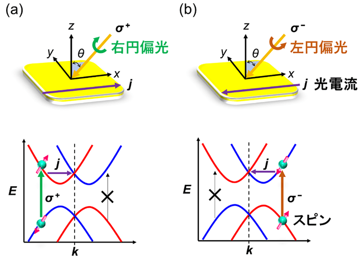 さらに、今回開発した半導体に円偏光[用語9]を照射したところ、外部電場を印加しない状態でも、光電流が発生することが観測されました。このような現象は、円偏光ガルバノ効果[用語10]と呼ばれ、光照射する物質が、スピン・軌道相互作用でスピン分裂した電子状態になっている場合に、励起される光キャリアの運動量分布に偏りが生じることに起因しています。特に今回開発した物質では、結晶のキラリティが右手系か左手系かで、円偏光ガルバノ効果で発生する光電流の符号が反転することが見出されました。キラリティに依存した円偏光ガルバノ効果からは、これまで実験的にほとんど観測されたことのない、キラルな系に特有な運動量空間における放射状のスピン構造の形成が示唆されました。