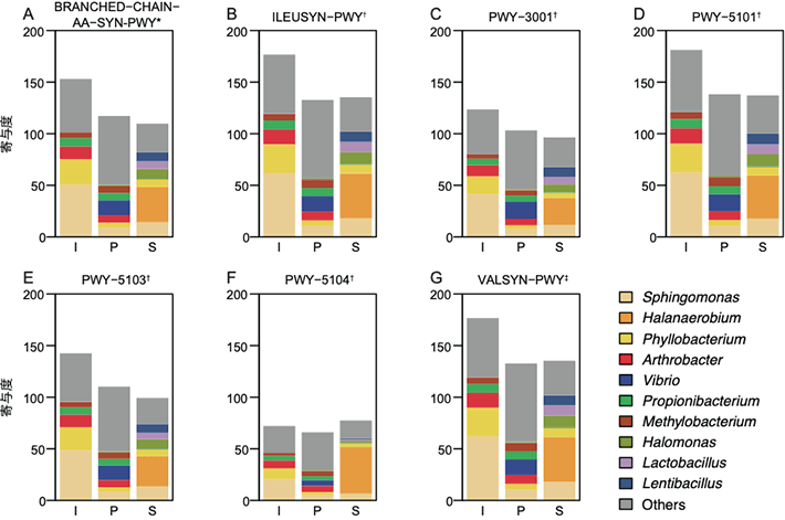 このことから、BCAA濃度の有意な差は代謝経路の量的な違いではなく、質的な違いによることが推測された。これらの代謝経路がどの微生物属によって担われているかを調べたところ、塩蔵工程では全ての経路においてHalanaerobium属による寄与が最も高くなった。