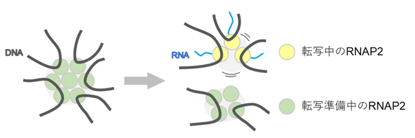 これまで、「転写ファクトリー」では巨大な複合体中で転写の開始と伸長の両方が行われていると考えられていたが、本研究により、転写開始複合体形成の場所と実際に転写が行われている場所が異なることが示唆された(図3)。この知見は、生きた細胞内での転写の制御機構の基本原理の解明に一歩近づくものである。
