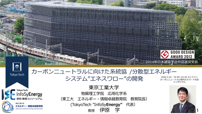 伊原教授は、カーボンニュートラルの実現に向けたエネルギーシステムの変革において、エネルギー技術開発と情報科学の融合分野が重要であることに触れた後、東工大で研究開発、実証している系統協調/分散型エネルギーシステム“エネスワロー”について、包括的に説明しました。特にエネスワローにおいて、東工大大岡山キャンパスのエネルギービックデータを取得し、産学連携研究や教育へ活用していることについて実例を交えながら紹介しました。