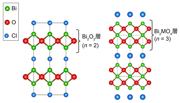 NaCl(塩化ナトリウム)に代表される岩塩型構造とCaF2(フッ化カルシウム)に代表される蛍石型構造は、無機化合物において、最も基本的な結晶構造です。また、岩塩層を持つ化合物や蛍石層を持つ化合物も数多く知られています。例えば、蛍石型構造と似た構造を持つ物質としては、高効率で安定な光触媒材料として、近年盛んに研究されているビスマス酸塩化物[用語3]という物質群があります。これらの物質は、ビスマス(Bi)と酸素(O)からなる蛍石層(Bi2O2層)と塩素層などが積層した層状物質で、層の組み合わせや積層の順序によりさまざまな物質群が合成可能であることが特徴です。Bi2O2層はBiが2列分存在しているため二重(n = 2)蛍石層と言われますが、最近我々のグループでは蛍石層の厚みnを増やした三重(n = 3)蛍石層を有する光触媒を開発しました(図1)。これは蛍石層の厚みnを制御することで、さらなる物質開発を示唆するものですが、現状報告されているビスマス酸塩化物ではn = 3が最大で、Bi–O層のバリエーションは非常に限られていました。