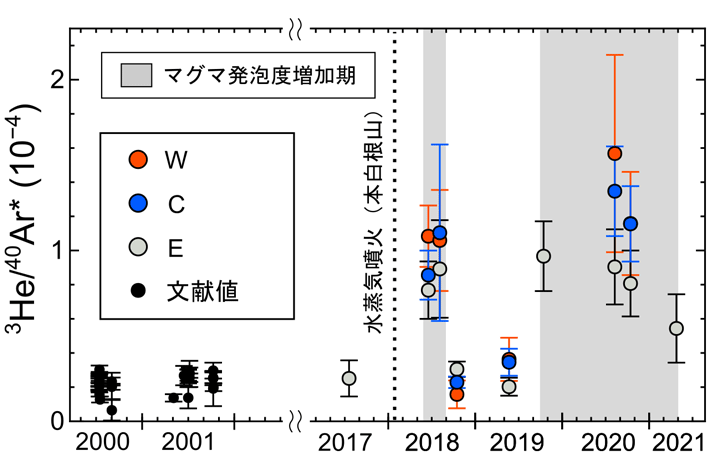 2000年から2001年にかけて同地点で採取された火山ガスの3He/40Ar*比(文献値)も示している。網掛けで示された3He/40Ar*比が高い時期にマグマ発泡度が増加していたと考えられる。点線は2018年1月に本白根山で発生した水蒸気噴火。