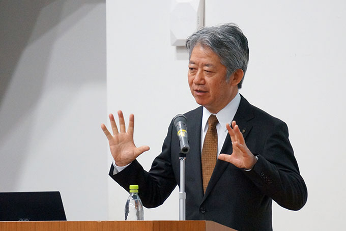 さらに、本学科学技術創成研究院 化学生命科学研究所/物質・情報卓越教育院長の山口猛央教授から「水素社会とアニオン交換膜を用いた水電解による水素製造」と題して、新材料を用いた水素製造について最新の研究成果が発表されました。