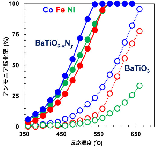最後に、h-BaTiO3−xNyのアンモニア分解触媒担体としての有用性を調べるため、Ni以外の非貴金属であるFeやCoを担持した触媒活性を調べた結果を図4に示す。FeやCoをh-BaTiO3−xNyに担持した触媒も、Ni/h-BaTiO3−xNyと同程度の高いアンモニア分解活性を示し、それぞれの金属種を酸化物であるBaTiO3に担持した触媒よりも100℃以上低温で作動することが示された。h-BaTiO3−xNy上の担持金属種を変えても触媒活性に大きな差が出なかった理由は、担持金属表面ではなく、h-BaTiO3−xNy担体上の窒素空孔サイトが活性点として機能するためであると考えられる。