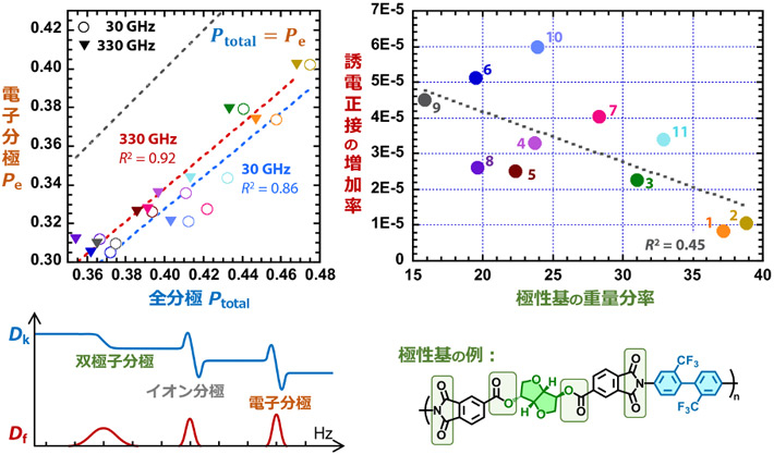図3. 11種類のポリイミドにおける(左)全分極と電子分極の相関と、(右)極性基の重量分率と誘電正接の増加率の相関。