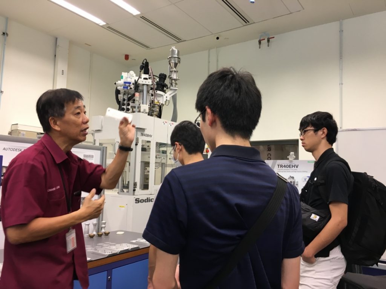 シンガポール工科デザイン大学にて、3Dプリンティングの装置の説明を聞いている様子